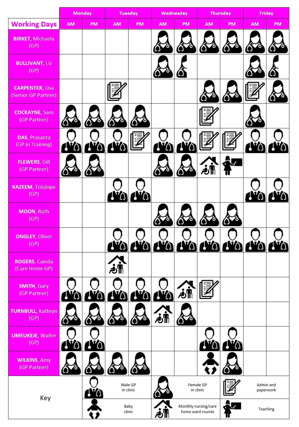 Training Practice and GP Working Weeks Posted on: 24th April 20256th November 2025 Please see below the timetable for when all of our GPs will be in throughout the week.